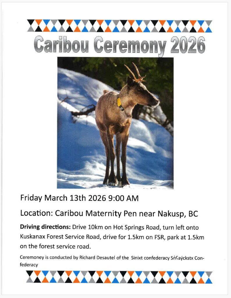 Our partner, Arrow Lakes Caribou Society, is having their annual open house on Friday, March 13th at the Central Selkirk Caribou Maternity Pen. At 9am, Rick Desautel of the Sinixt Confederacy will offer a Caribou Ceremony to honor the caribou and make offerings for their recovery. The open house starts at 10am and is a great opportunity to learn about caribou recovery, ask questions, and tour the pen.